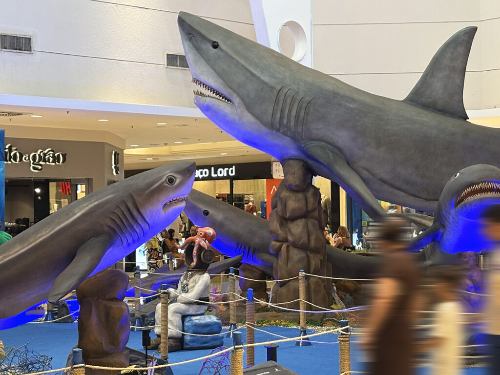 Sharks & Cia – Considerada a maior exposição de tubarões do Brasil, a atração reúne réplicas em tamanho real de 25 espécies, em modelos animatrônicos com movimentos e sons. A visitação é gratuita e acontece na Praça de Eventos Ipê, de segunda a sábado, das 10h às 22h, e aos domingos, das 12h às 21h. Aos fins de semana, biólogos da Fundação Mamíferos Aquáticos realizam visitas guiadas às 17h, proporcionando uma experiência ainda mais interessante. A participação é mediante agendamento pelo aplicativo do Shopping Jardins (Android e iOS).