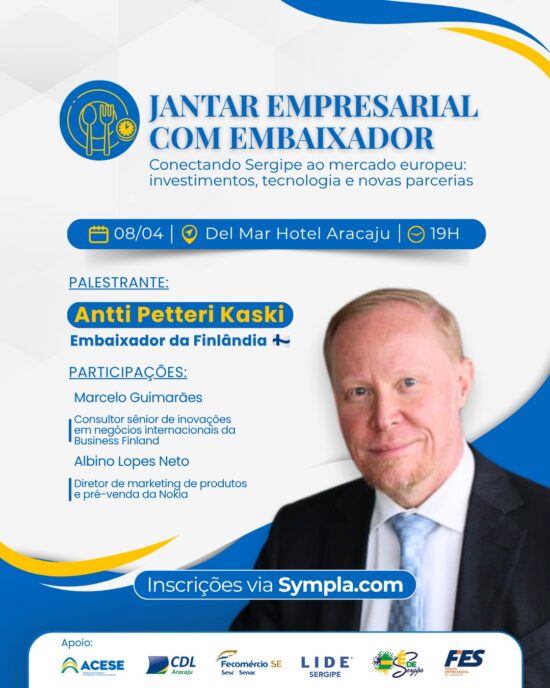 Aracaju será palco de um importante encontro internacional voltado ao fortalecimento da economia local. Na próxima quarta-feira, 8 de abril, o embaixador da Finlândia no Brasil, Antti Petteri Kaski, participará de um jantar com empresários sergipanos, em uma agenda estratégica que busca estreitar relações institucionais e abrir novas oportunidades de negócios no estado.