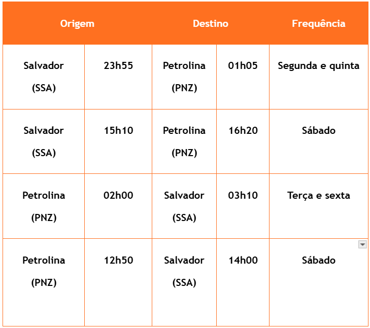 A operação, iniciada no último dia 29 de setembro, disponibiliza voos partindo às 23h55 de Salvador e pousando em Petrolina à 1h05 da madrugada, às segundas e quintas. Há também um voo que decola rumo a Petrolina aos sábados à tarde, saindo de Salvador às 15h10. No caminho inverso, há voos às 2h, partindo de Petrolina e pousando no aeroporto de Salvador às 3h10 da madrugada, às terças e sextas. Além desses dias, há um voo aos sábados, que decola de Petrolina para Salvador às 12h50.